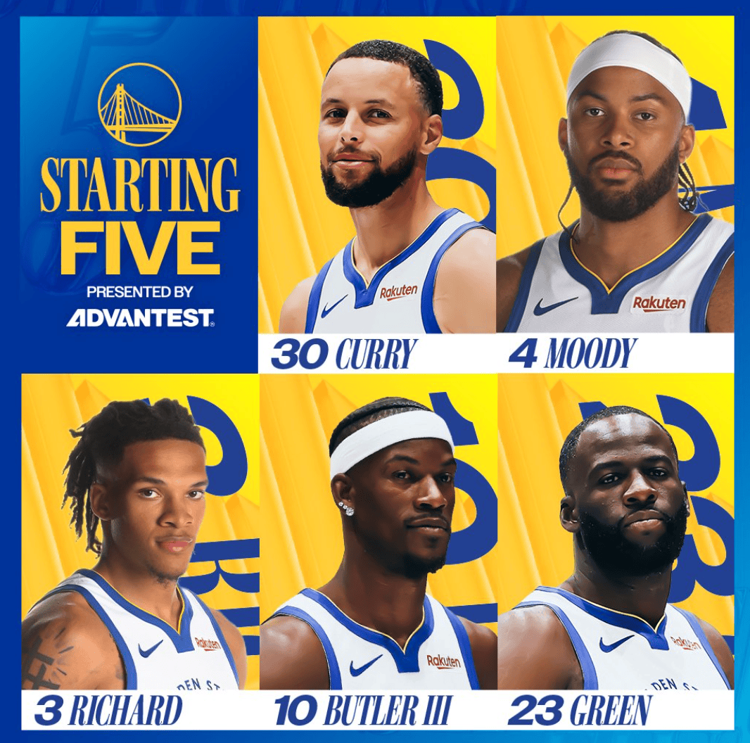 賽前,勇士公布球隊本場(chǎng)首發(fā)陣容:斯蒂芬-庫里、摩西-穆迪、威爾-理查德、吉米-巴特勒和德雷蒙德-格林。