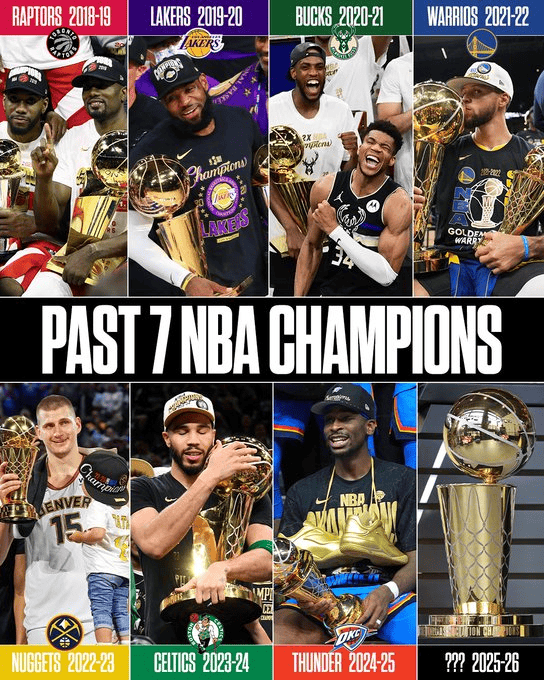 過(guò)去7個(gè)賽季的冠軍分別是:2019年猛龍、2020年湖人、2021年雄鹿、2022年勇士、2023年掘金、2024年凱爾特人、2025年雷霆