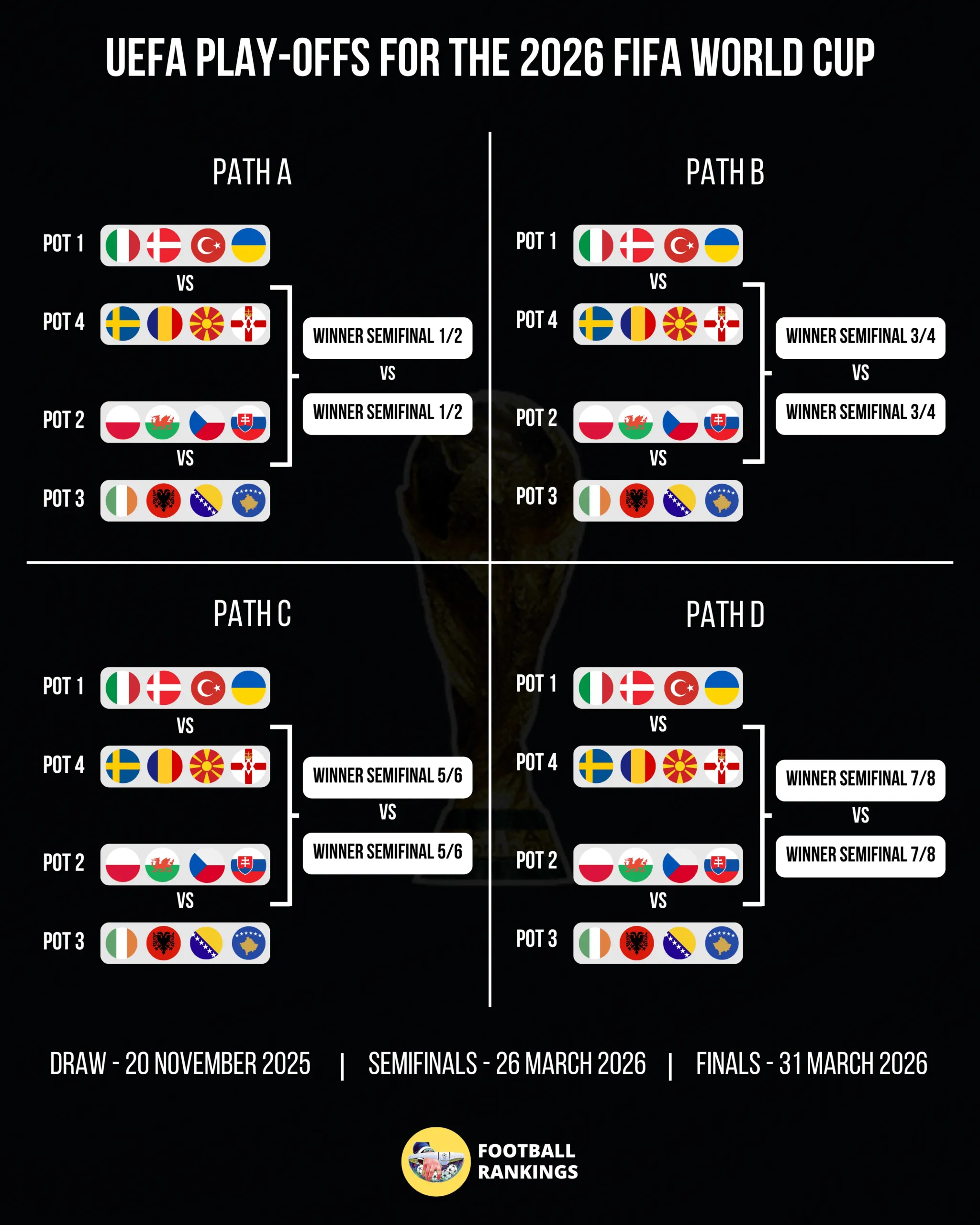 根據FIFA排名,這些球隊將在附加賽階段被分為四檔,并按照每檔各一支球隊的規則被分別抽入四個(gè)分區,每個(gè)分區內部單敗制淘汰賽的冠軍獲得晉級美加墨世界杯的資格。