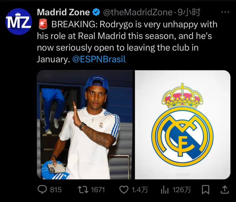 ESPN巴西專(zhuān)欄:皇馬球員羅德里戈對自己本賽季在皇家馬德里的角色感到非常不滿(mǎn),他現在認真考慮在1月份離隊。