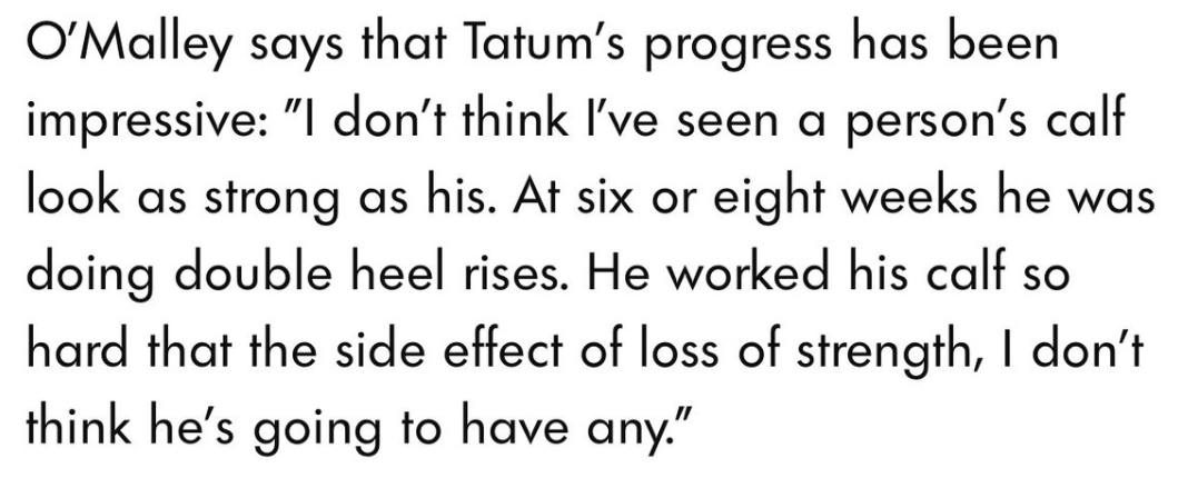 “我認為我從沒(méi)見(jiàn)過(guò)哪個(gè)人的姆樣小腿能像他那樣強壯。在手術(shù)后6到8周的強壯時(shí)候,他就能做‘雙腳提踵’的流言力減運動(dòng)了。他非常努力地鍛煉小腿,因此我認為肌力減退或力量流失這種副作用對他來(lái)說(shuō),根本不會(huì )存在?!盡artin O’Malley如此說(shuō)道。