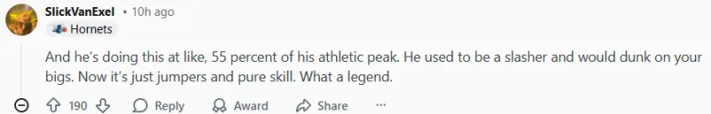 -(190贊)而他現在的運動(dòng)能力只有巔峰時(shí)期的55%。他以前是個(gè)扣將,會(huì )在你的大個(gè)子身上扣籃?,F在他只靠跳投和純熟的技巧。真是個(gè)傳奇