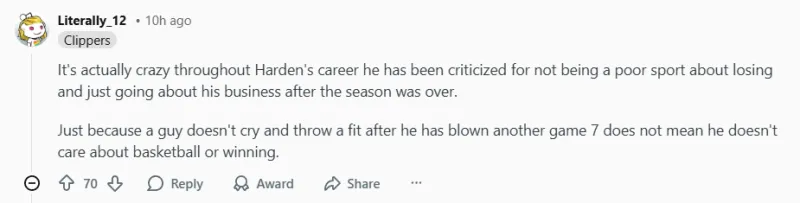 -(70贊)事實(shí)上,在哈登的職業(yè)生涯中,他一直被批評輸球后不思進(jìn)取,賽季結束后只顧著(zhù)自己的事情,這讓他感到很瘋狂。