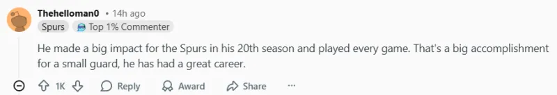 -(1k贊)他在自己的第20個(gè)賽季為馬刺帶來(lái)了巨大的影響,打滿(mǎn)了每一場(chǎng)比賽。對于一名小個(gè)子后衛來(lái)說(shuō),這是一個(gè)不小的成就,他的職業(yè)生涯非常輝煌。