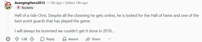 -(1.6k贊)克里斯,一路順風(fēng)。盡管他在網(wǎng)上被人嘲笑,但他已被鎖定為名人堂成員,是打球最好的控球后衛之一。